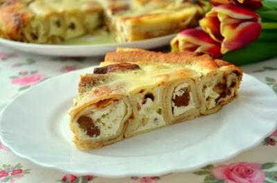 Теперь приготовьте начинку. Смешайте 500 гр. творога с 1 яйцом, 100 гр. изюма и пакетиком ванильного сахара. На каждый блинчик положите начинку, примерно 3 ст.л. и заверните трубочки.